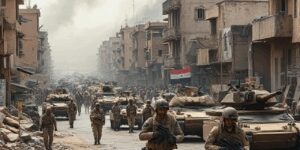 Checking out the Causes, Outcomes, and Lasting Effect of the 2003 Intrusion. The photo should reveal a war-torn city with damaged buildings, army storage tanks, and soldiers patrolling the roads. …