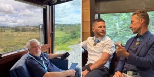 (Civil Battle Picket photos) Jim McCloughan, Kyle Woodworker and Britt Slabinski (from left) were among 13 Medal of Honor receivers who rode a CSX exec train Tuesday afternoon that reenacted …
